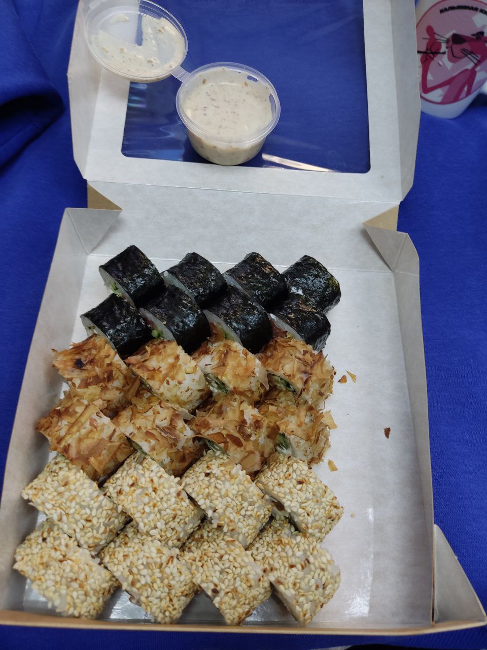 - "Аризона фрай": филе лосося, сливочный сыр, огурец, такуан, панировка - 5 шт.