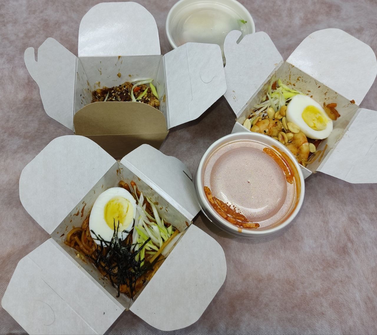 - рамэн с цыпленком (размер "М"): мясной бульон, пшеничная лапша, цыпленок, ростки сои, зеленый горошек, омлет тамаго, кунжут, морковь, салат ромен, лук перо зеленый