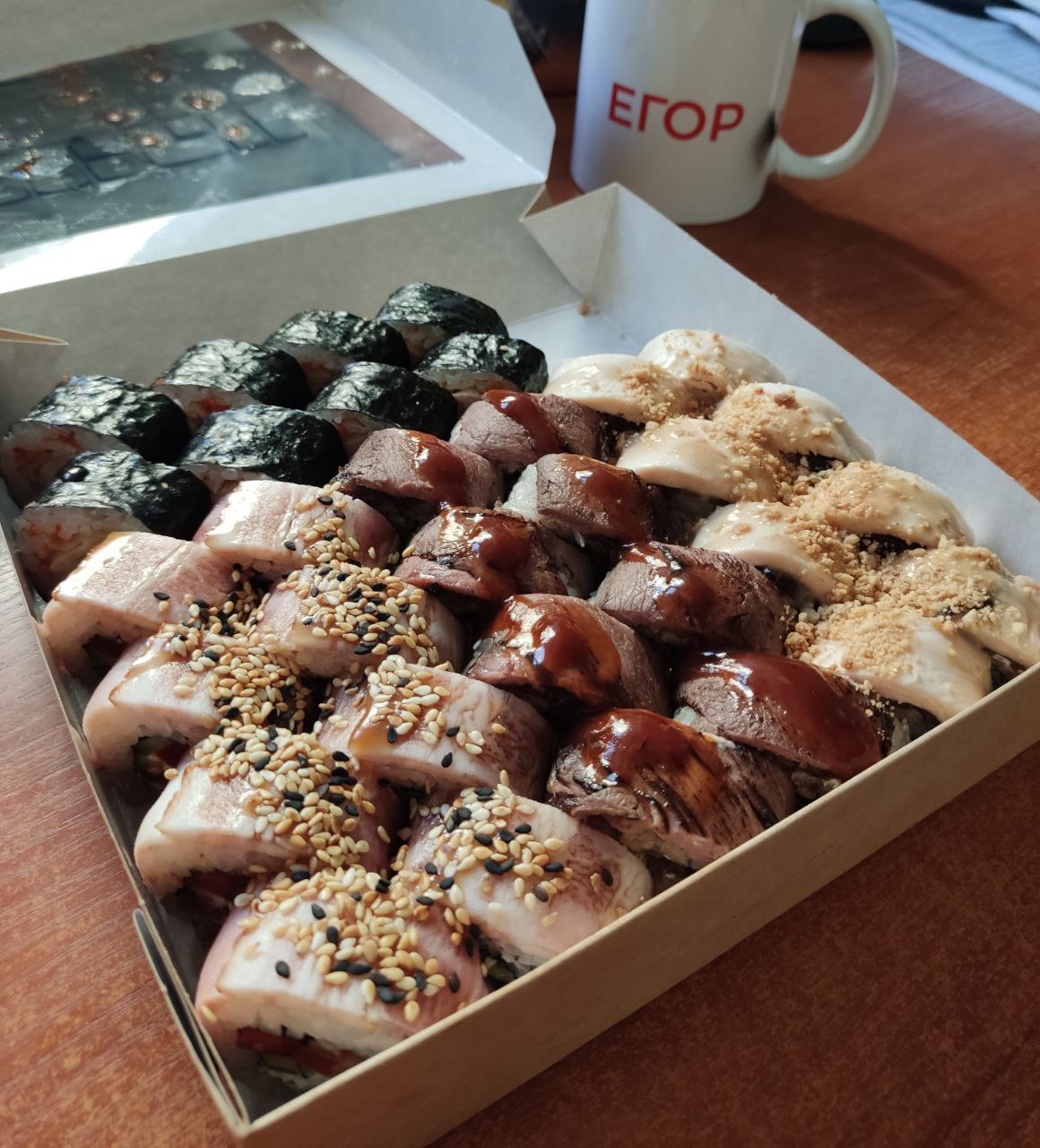 - ролл "Колорадо": жареный лосось в соусе терияки, сыр чеддер, соус сырный, криспи - 8 шт.