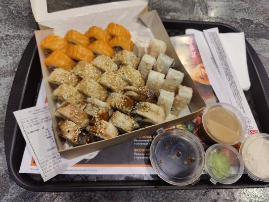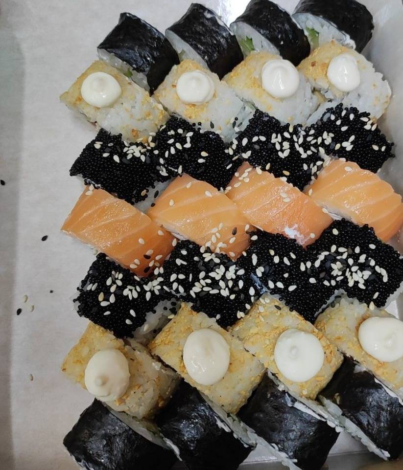 - "Чарлстон": филе лосося, сливочный сыр, филе тунца, лук жареный, огурец - 8 шт.