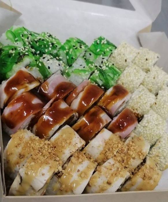- "Магуро грин": филе тунца, сливочный сыр, салат Айсберг, салат чука, сурими, соус ореховый классик - 8 шт