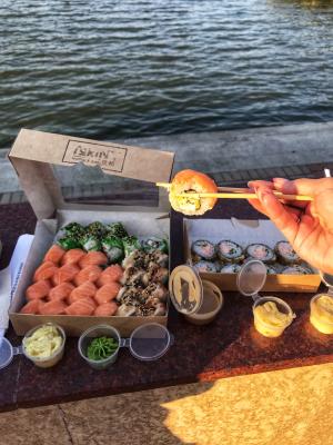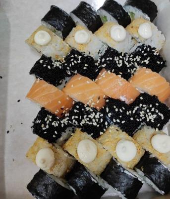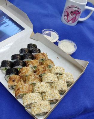 - "Манхеттен": филе лосося, сливочный сыр, авокадо, огурец, кунжут - 8 шт.
