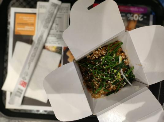 - удон с цыпленком-гриль в соусе карри (размер "М", острое): удон в соусе карри, цыпленок, пекинская капуста, морковь, спаржевая фасоль, сладкий перец, такуан, яйцо, перец чили, лук-порей, кунжут