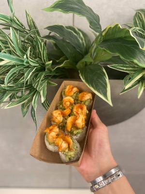 - "Бостон": креветка, сливочный сыр, ананас, салат Айсберг, соус сладко-ореховый, икра Тобико красная. Острое - 8 шт.