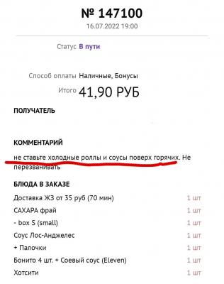 Хочу выразить свое недовольство. Вчера заказывала роллы. Заказ был отправлен в 23:44 ,пришла смс "ожидайте доставку в 00:44". В итоге приехали в 01:19 . Адрес находится в зелёной зоне.Пока ожидала 10 раз уже думала лечь спать и просто забить.