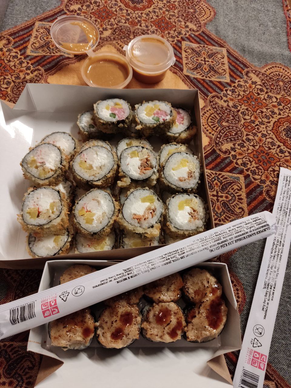 🥰 заказывали с молодым человеком уже не в первый раз сет «Жара». очень нравятся фрай роллы ваши. также пробовали различные другие сеты. стоит отдать вам должное за большое разнообразие разных роллов, все они замечательные, вопросов нет: скручены аккуратно, разложены соотвественно, начинки много. хочется ещё отметить очень качественную и свежую рыбу, всегда свежие овощи и мягкий сыр. заказываем из Колодищ.