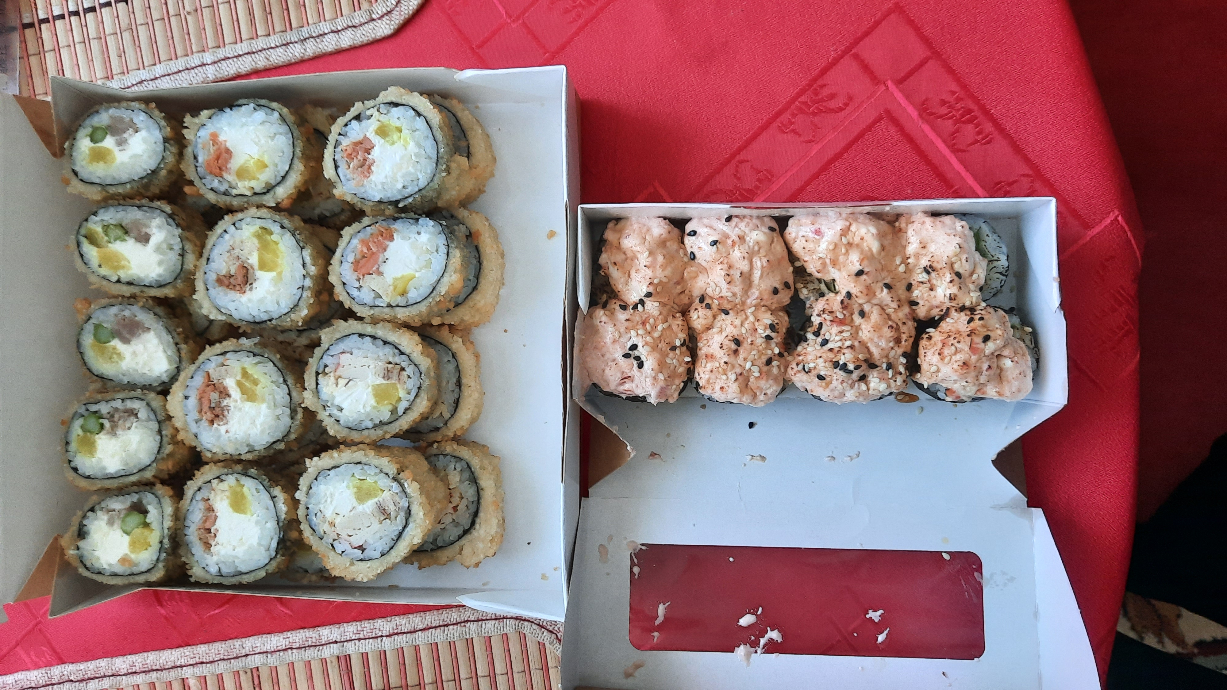 - "Бостон": креветка, сливочный сыр, ананас, салат Айсберг, соус сладко-ореховый, икра Тобико красная. Острое - 8 шт.