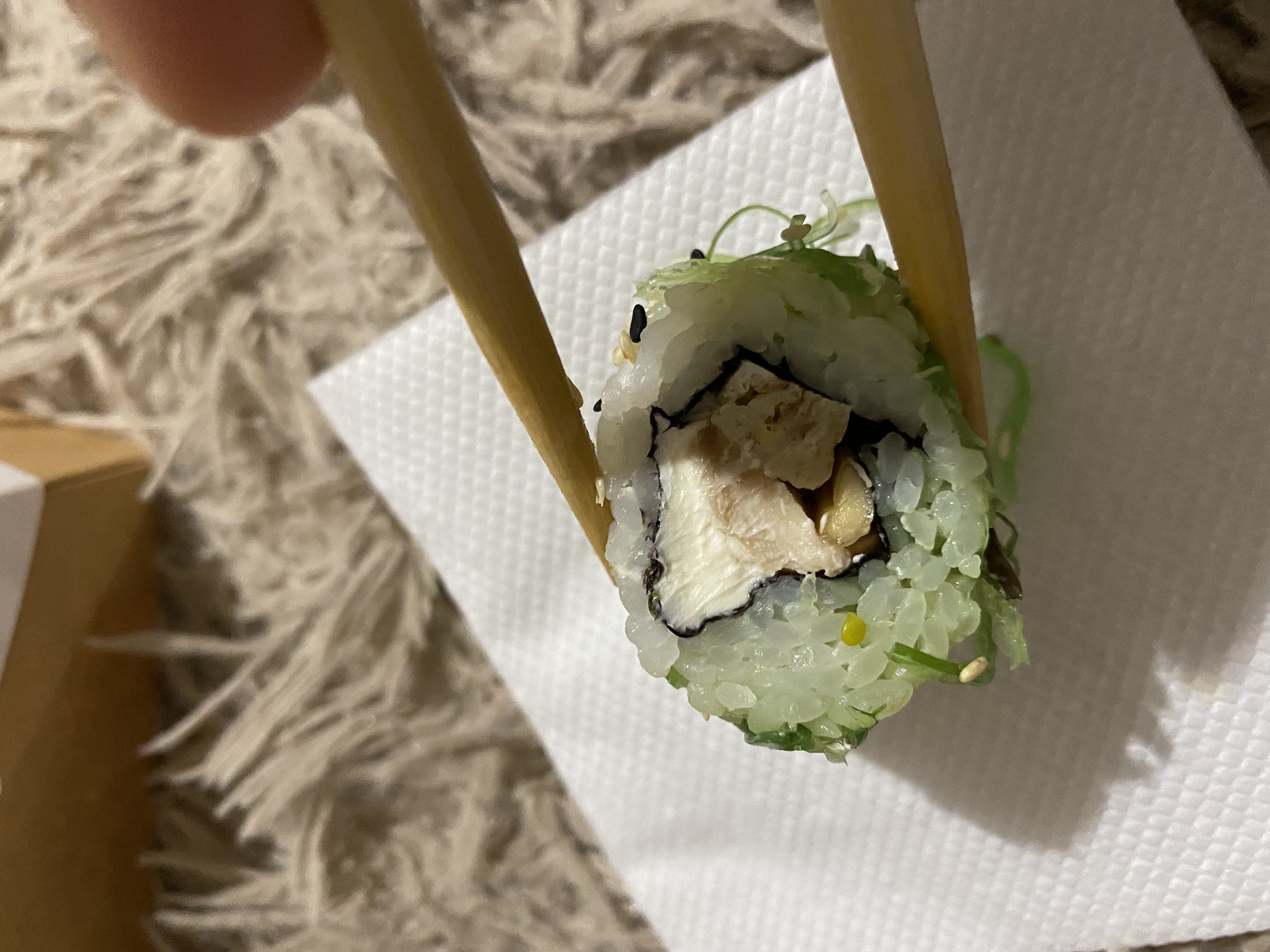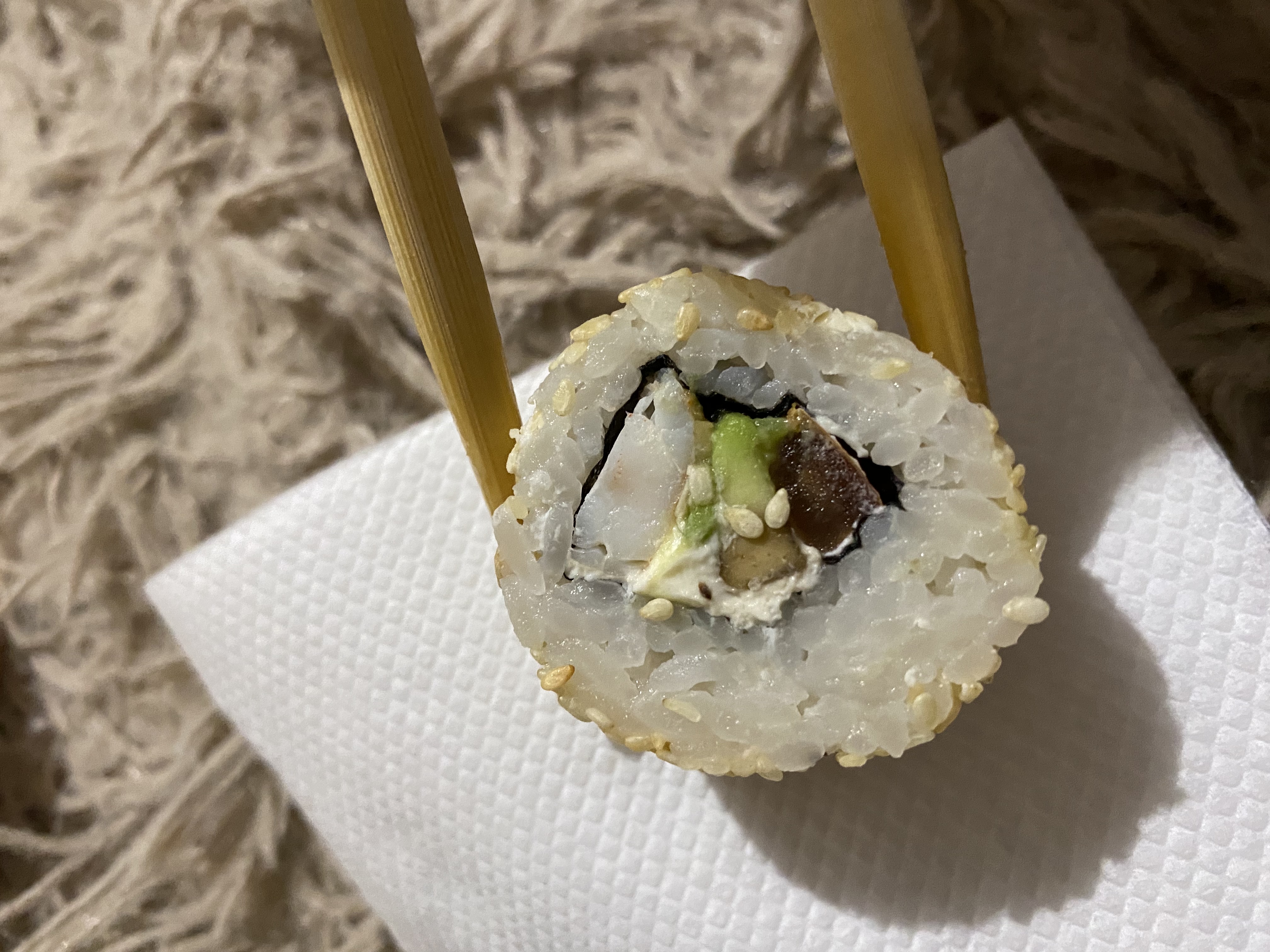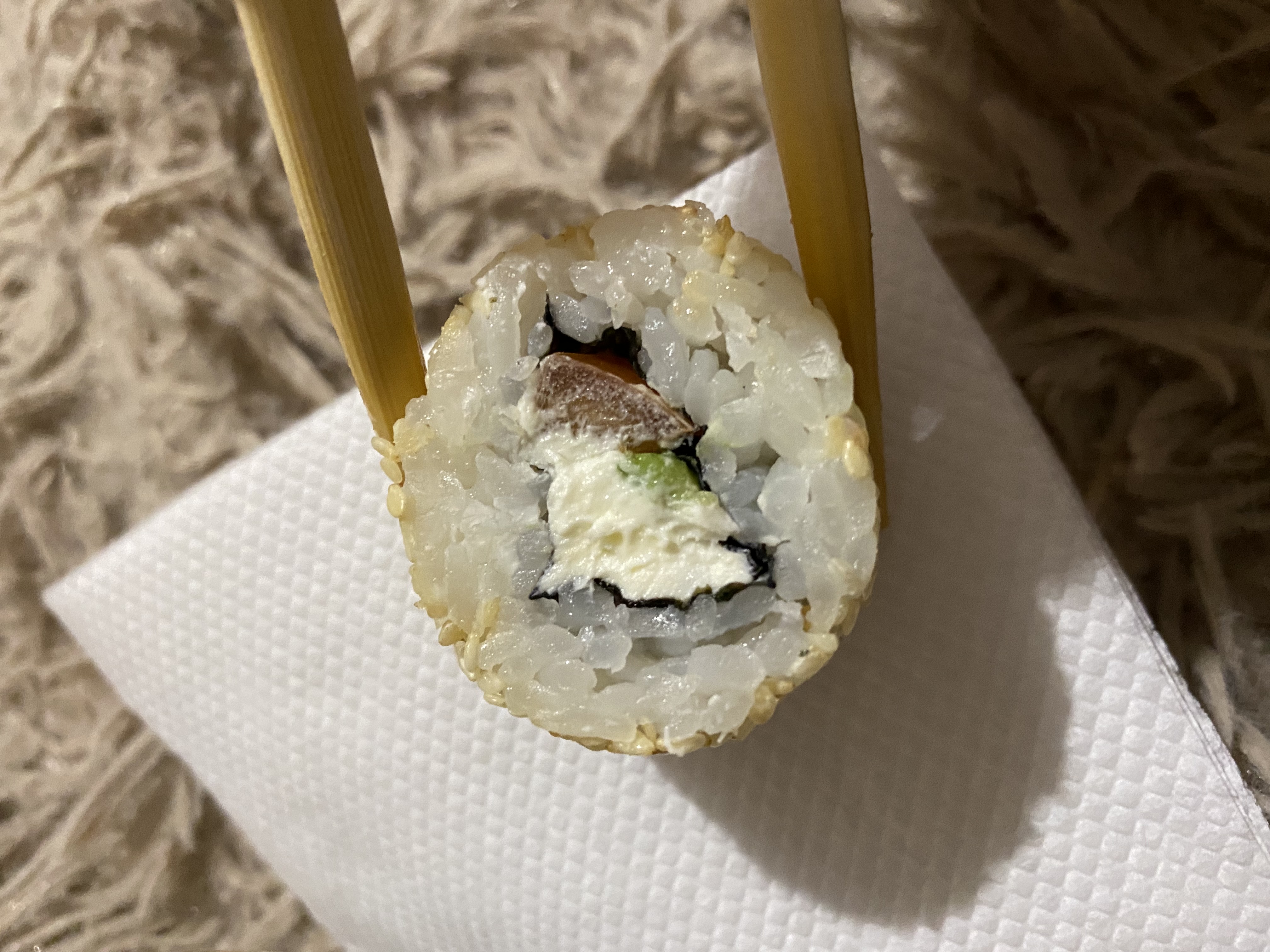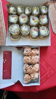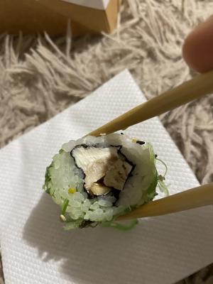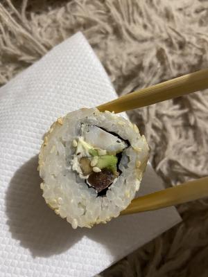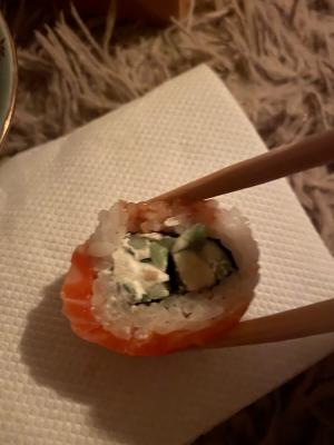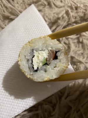 - "Манхеттен": филе лосося, сливочный сыр, авокадо, огурец, кунжут - 8 шт.