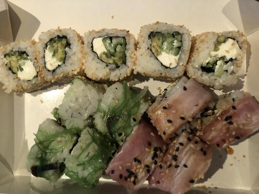 - "Магуро грин": филе тунца, сливочный сыр, салат Айсберг, салат чука, сурими, соус ореховый классик - 8 шт