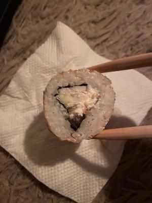 - "Ролл с жаренным окунем": жареный окунь, сливочный сыр, огурец - 8 шт.