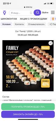 - Промокод дает право на скидку до 30% на доставку и до 40% при заказе на самовывоз (скидка распространяется только на акционные сеты)