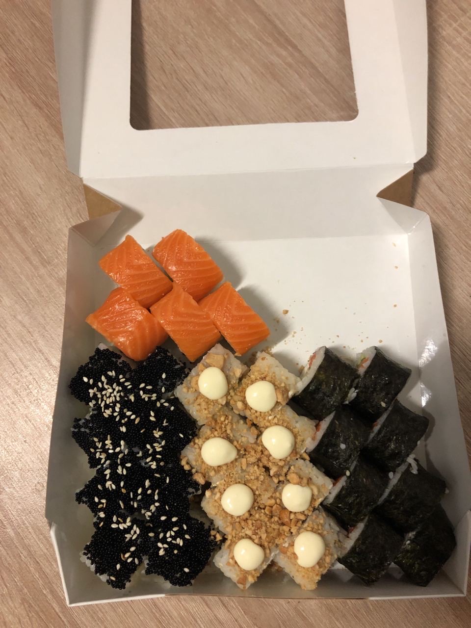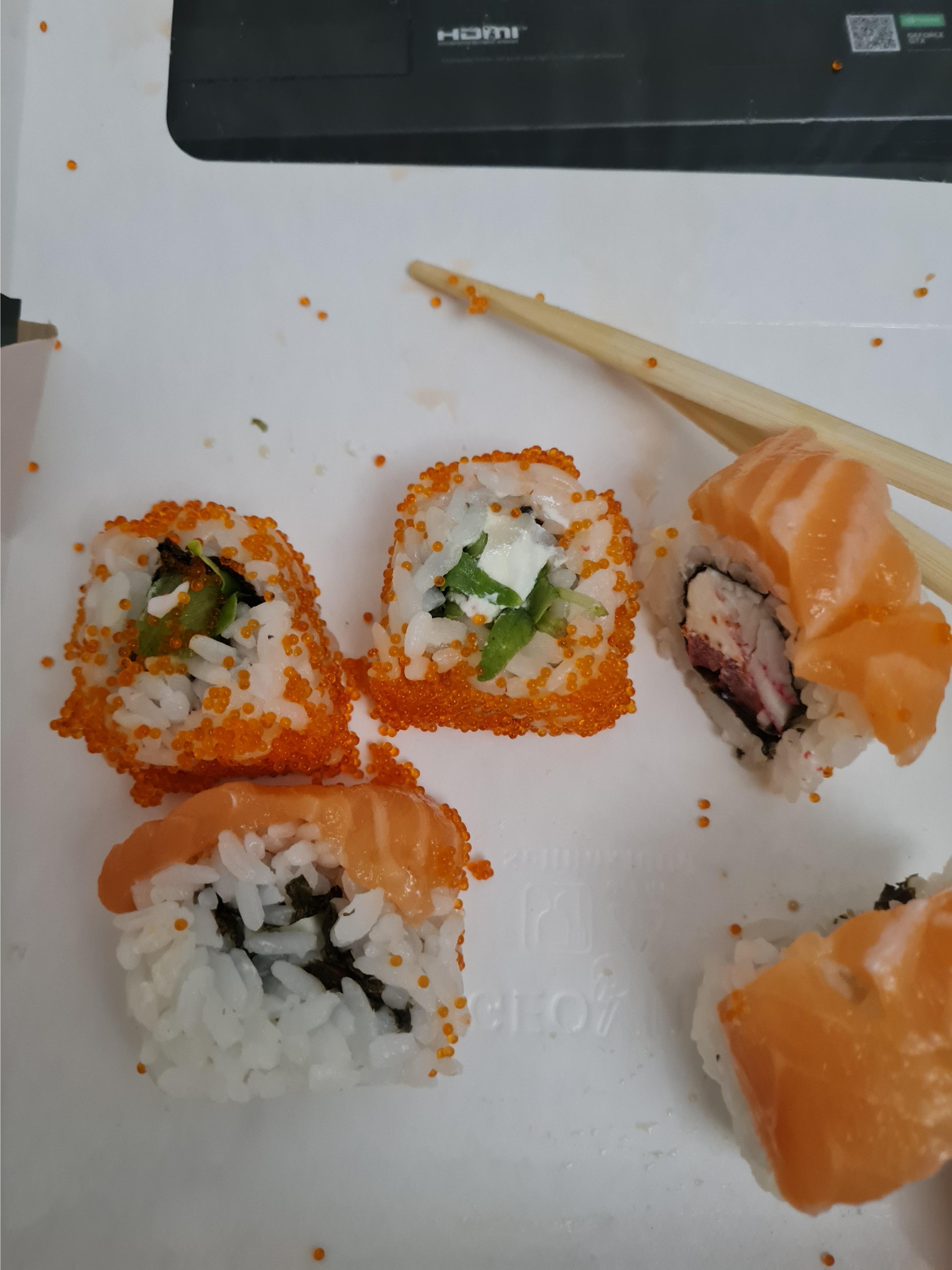- "Манхеттен": филе лосося, сливочный сыр, авокадо, огурец, кунжут - 8 шт.