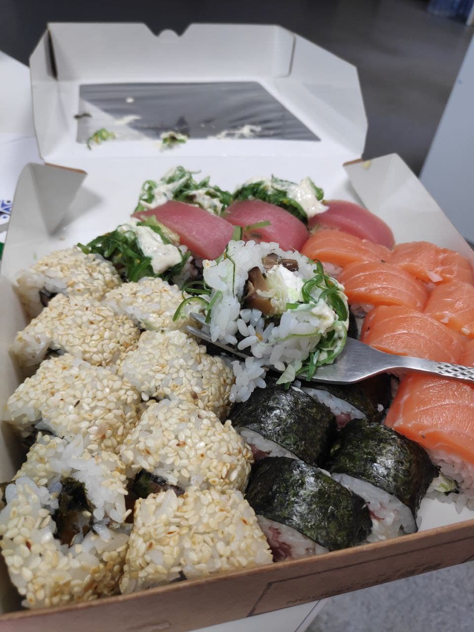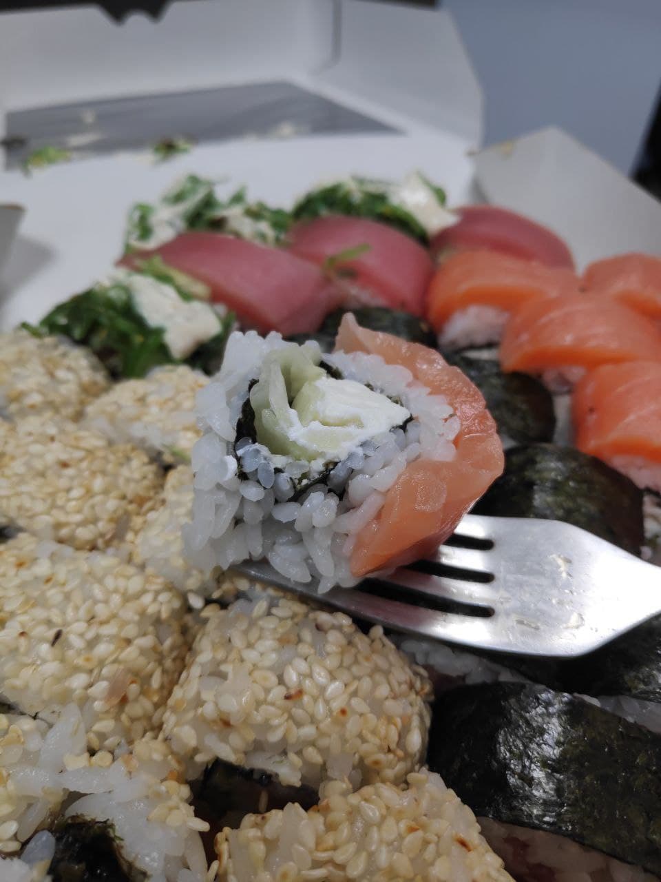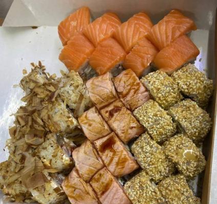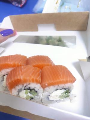 - "Манхеттен": филе лосося, сливочный сыр, авокадо, огурец, кунжут - 8 шт.