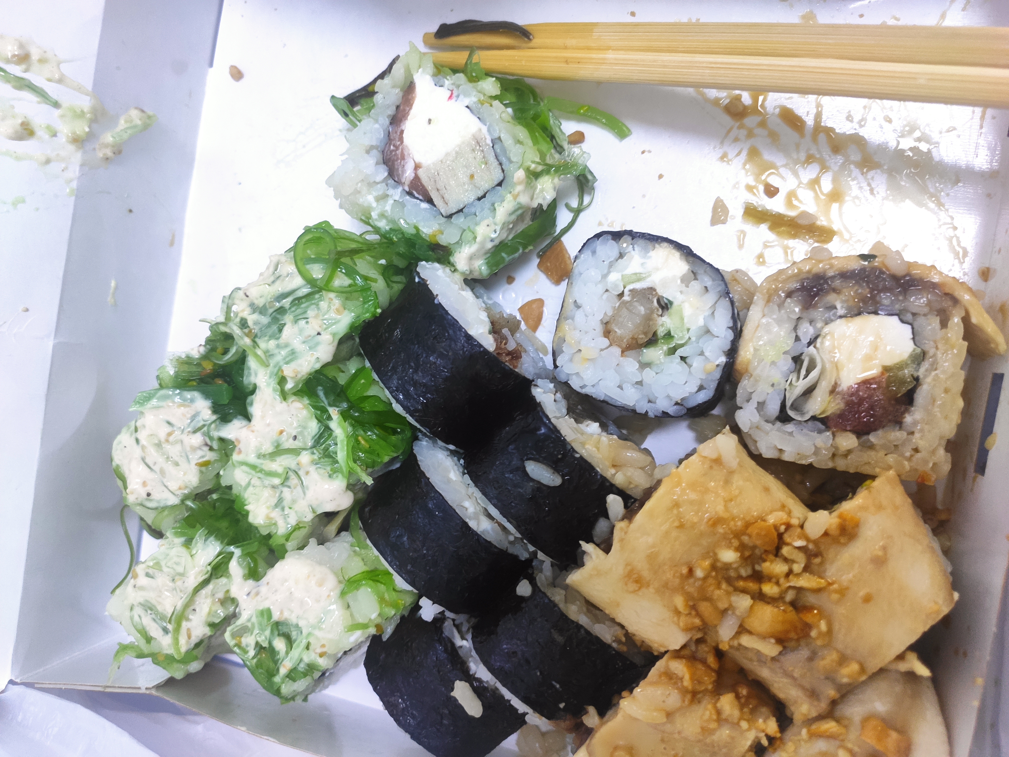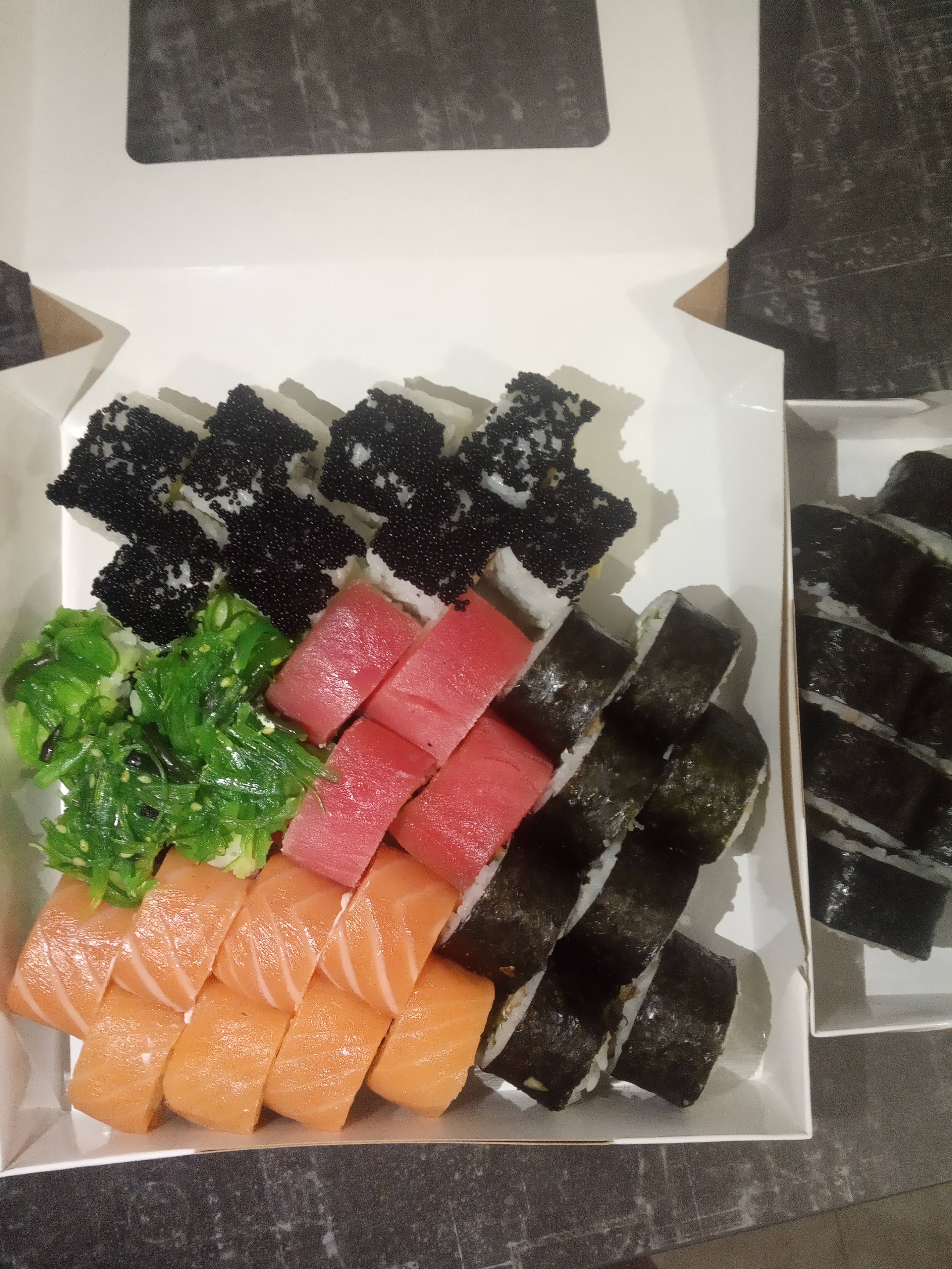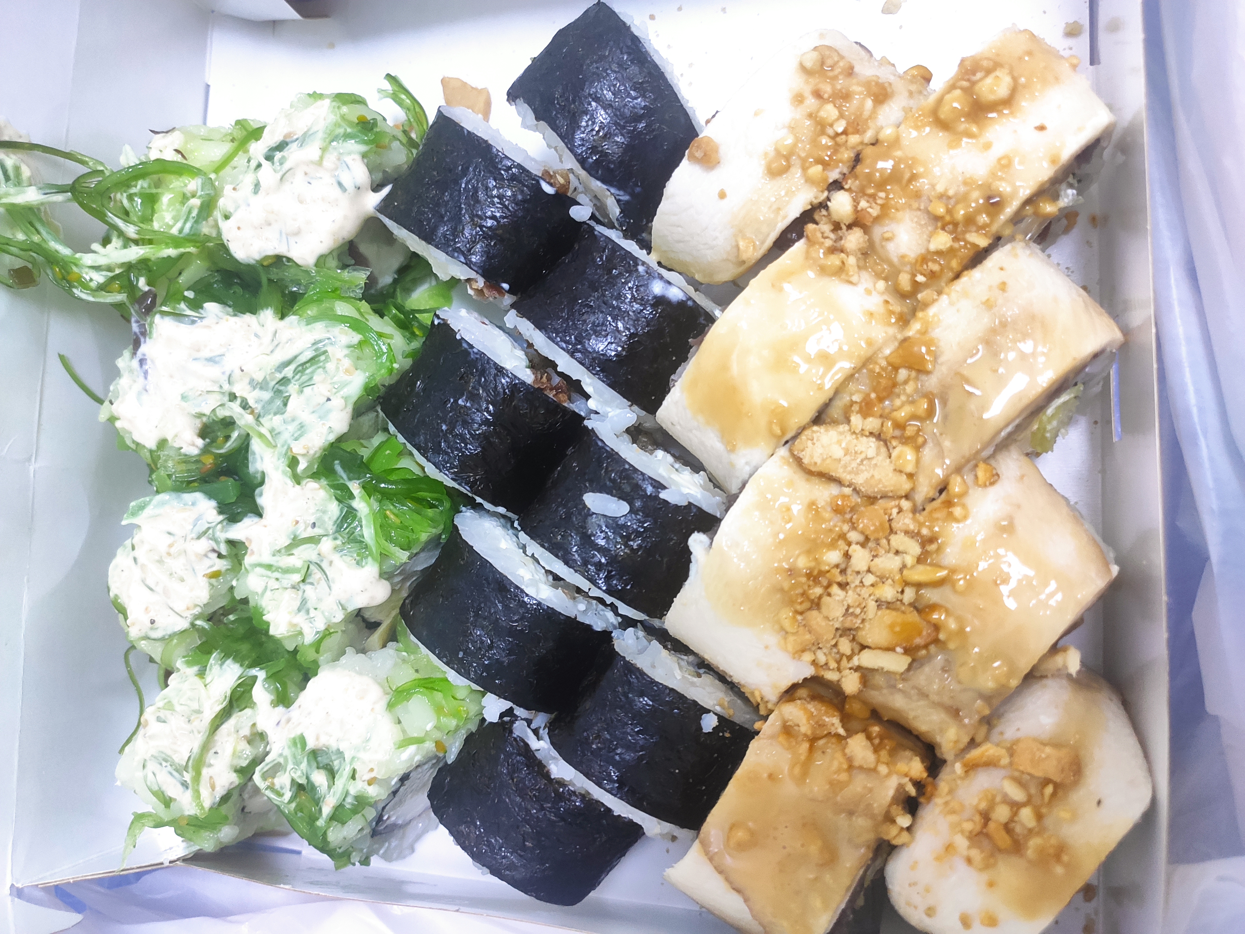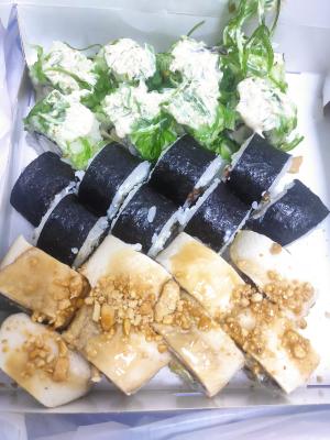 - "Магуро грин": филе тунца, сливочный сыр, салат Айсберг, салат чука, сурими, соус ореховый классик - 8 шт