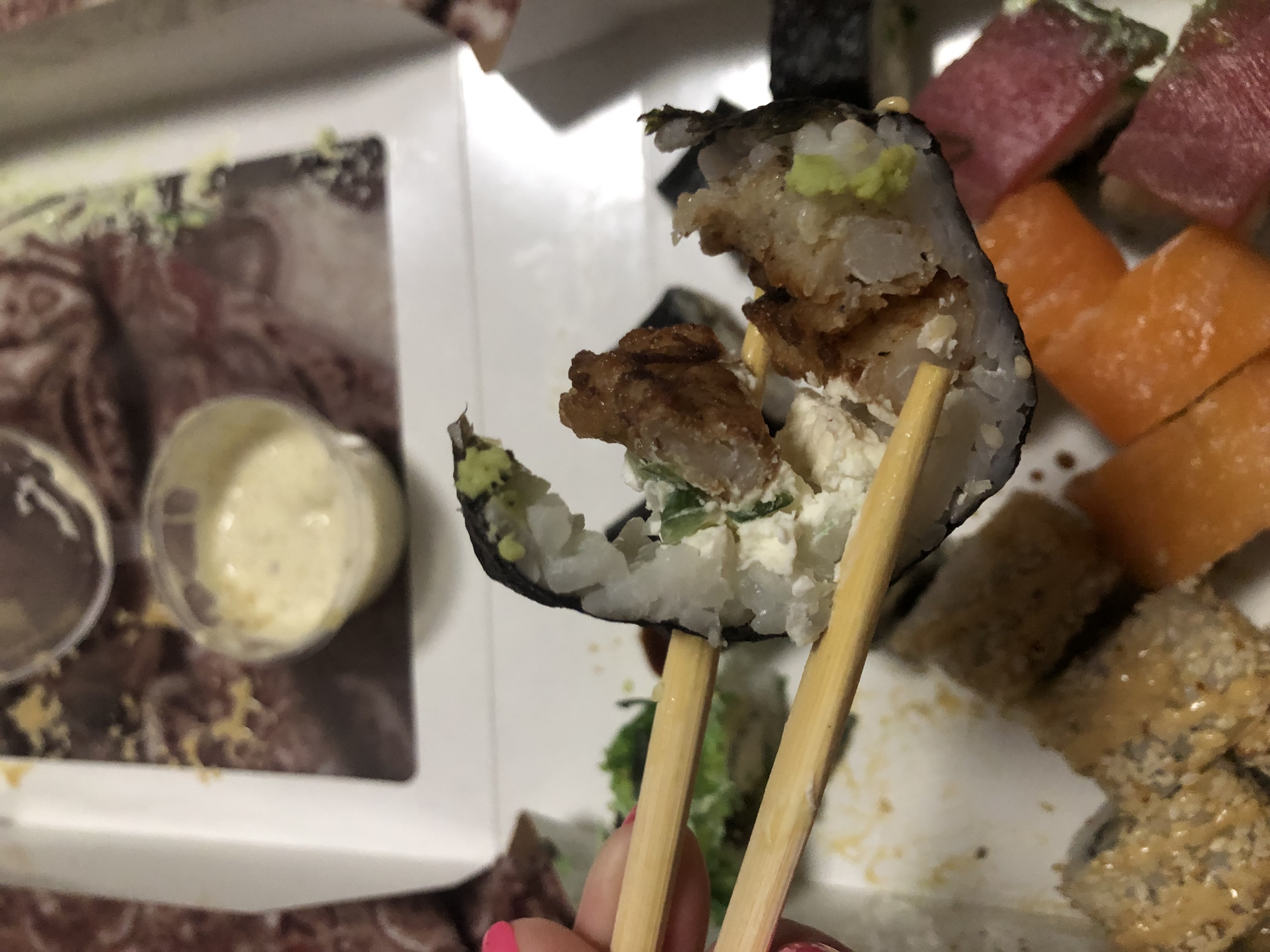 - "Спайси краб 🌶": сурими, сливочный сыр, ананас, салат Айсберг, соус Терияки, острый соус - 8 шт.