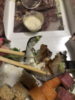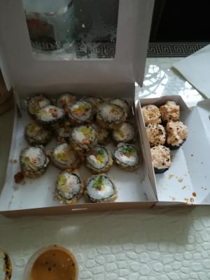 - "Бостон": креветка, сливочный сыр, ананас, салат Айсберг, соус сладко-ореховый, икра Тобико красная. Острое - 8 шт.