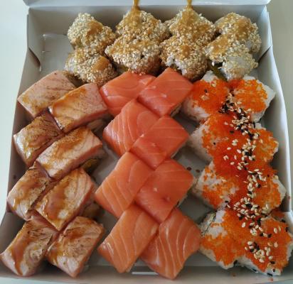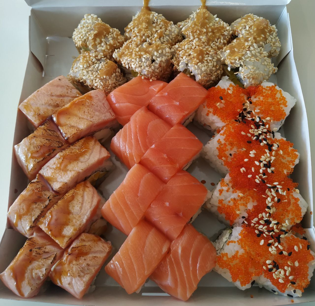 - "Манхеттен": филе лосося, сливочный сыр, авокадо, огурец, кунжут - 8 шт.