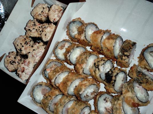 - "Аризона фрай": филе лосося, сливочный сыр, огурец, такуан, панировка - 5 шт.