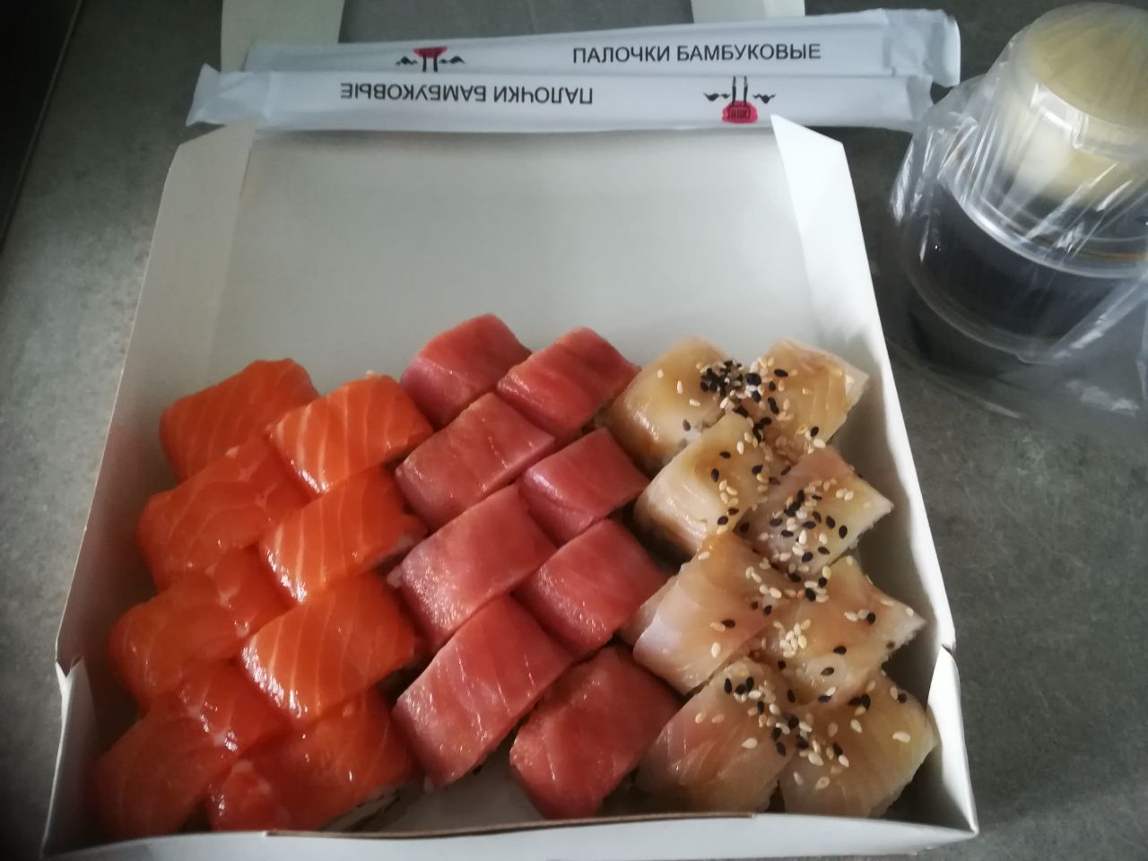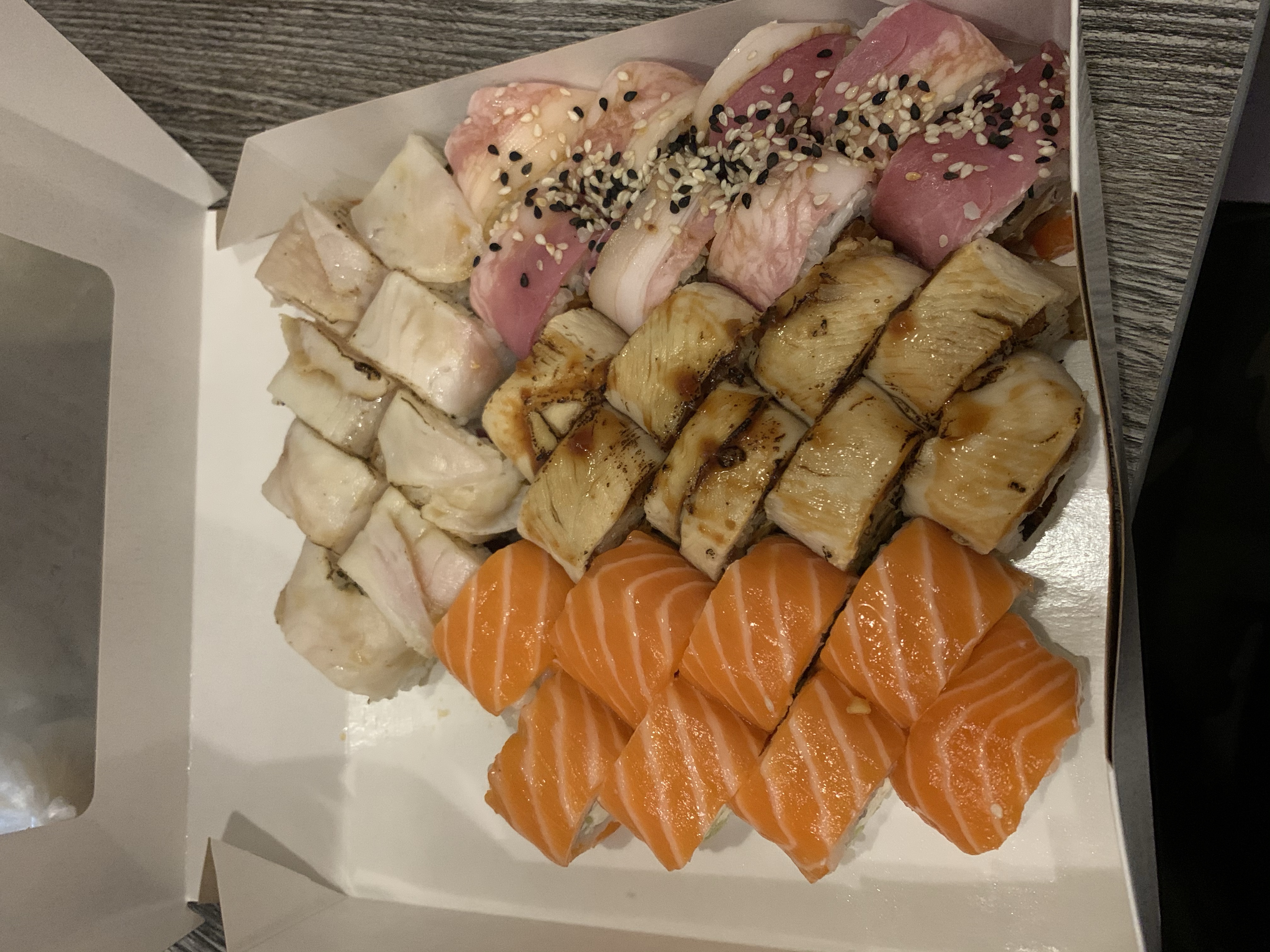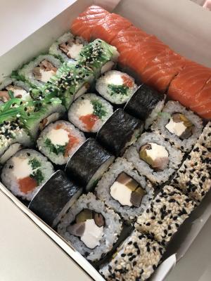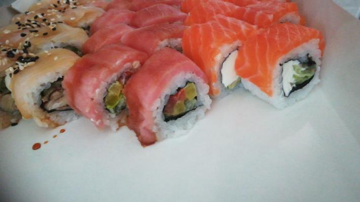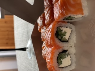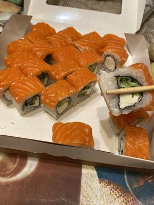 - "Манхеттен": филе лосося, сливочный сыр, авокадо, огурец, кунжут - 8 шт.