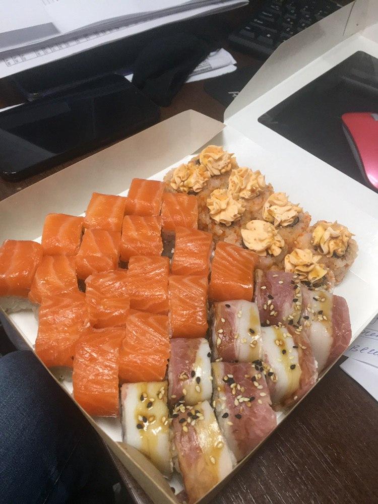 - "Чарлстон": филе лосося, сливочный сыр, филе тунца, лук жареный, огурец - 8 шт.