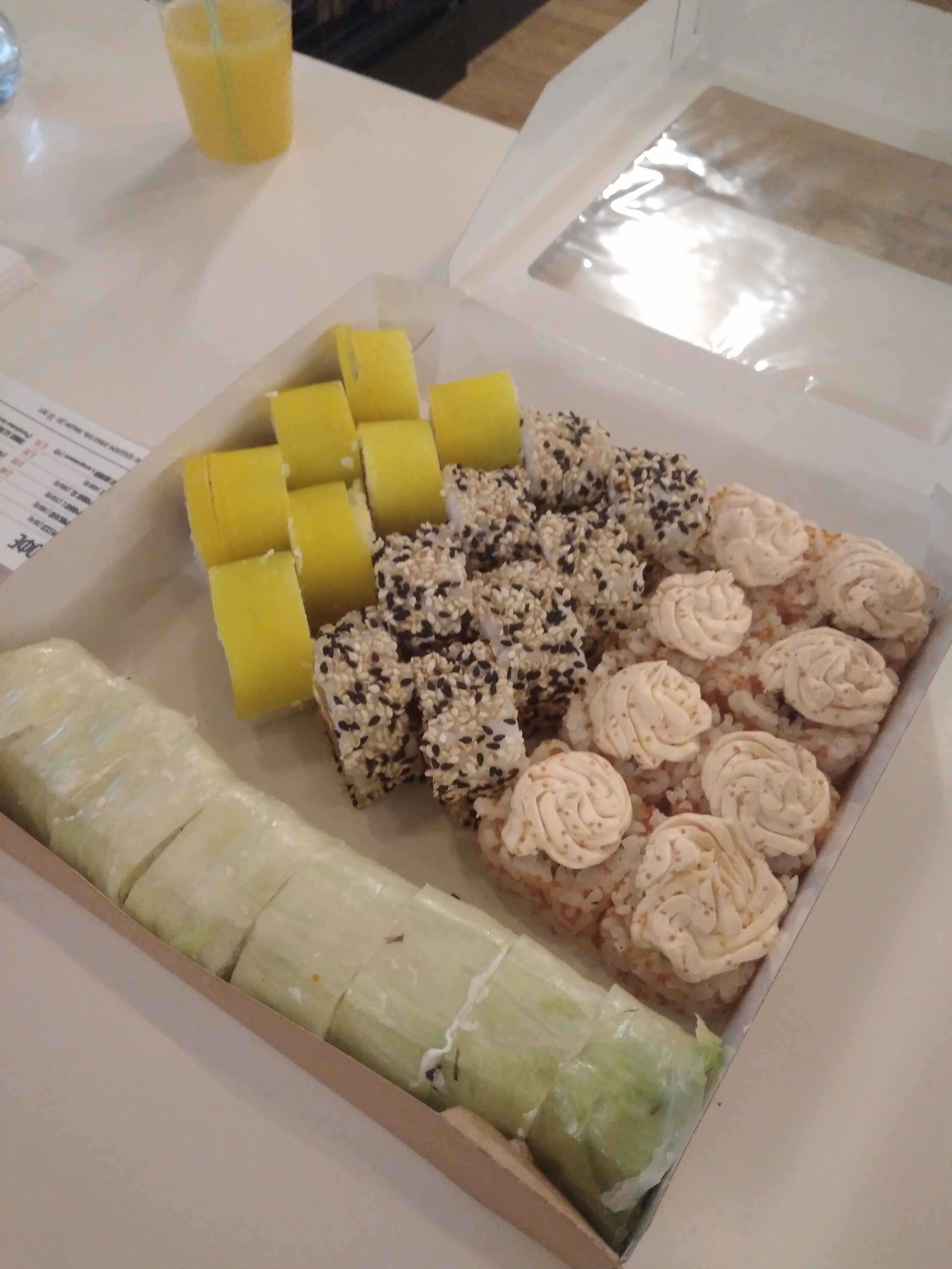 - ролл с лососем и манго в кунжуте кимчи: филе лосося, сливочный сыр, салат айсберг, манго, кунжут кимчи - 8 шт.