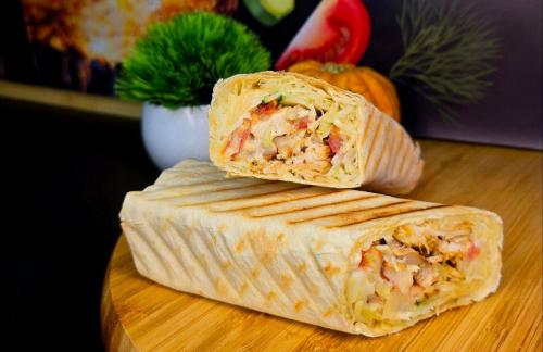 Состав: лаваш, чесночный соус, свежий огурец, томат, капуста, куриное мясо, сыр, сырный соус