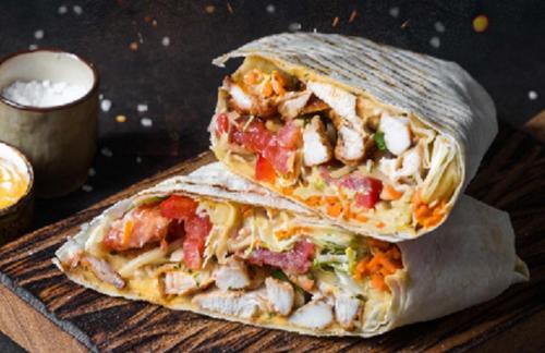 Состав: лаваш, чесночный соус, капуста, свежий огурец, томат, лук с зеленью, куриное мясо, перец халапеньо, острый соус